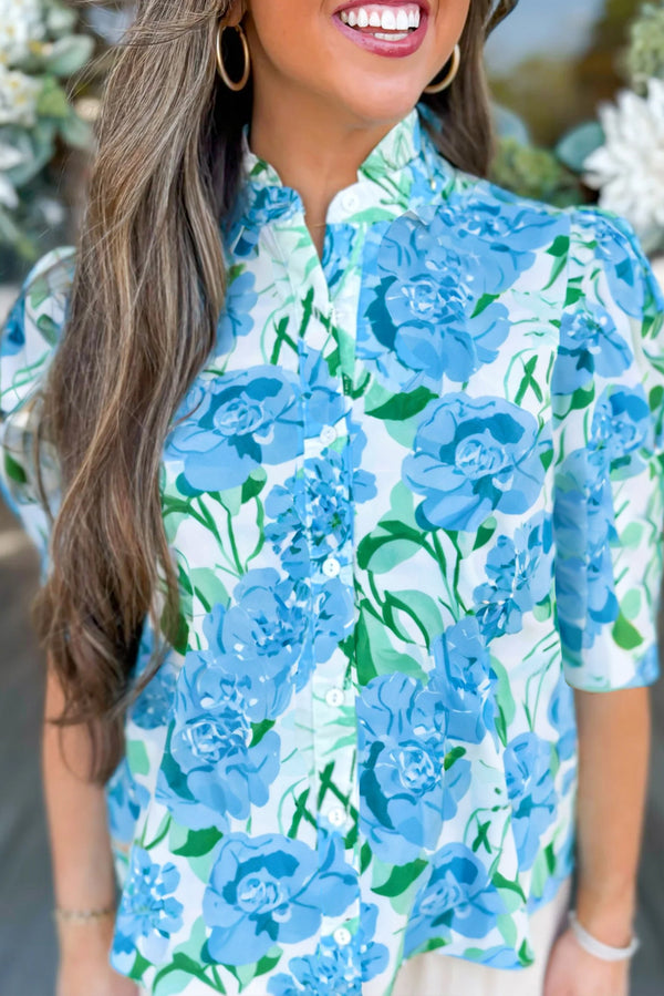 Sky Blue Ricrac Trim Slit V Neck Short Sleeve Floral Blouse