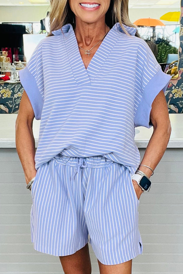 Sky Blue Stripe Bow Knot Textured Short Puff Sleeve Babydoll Blouse
